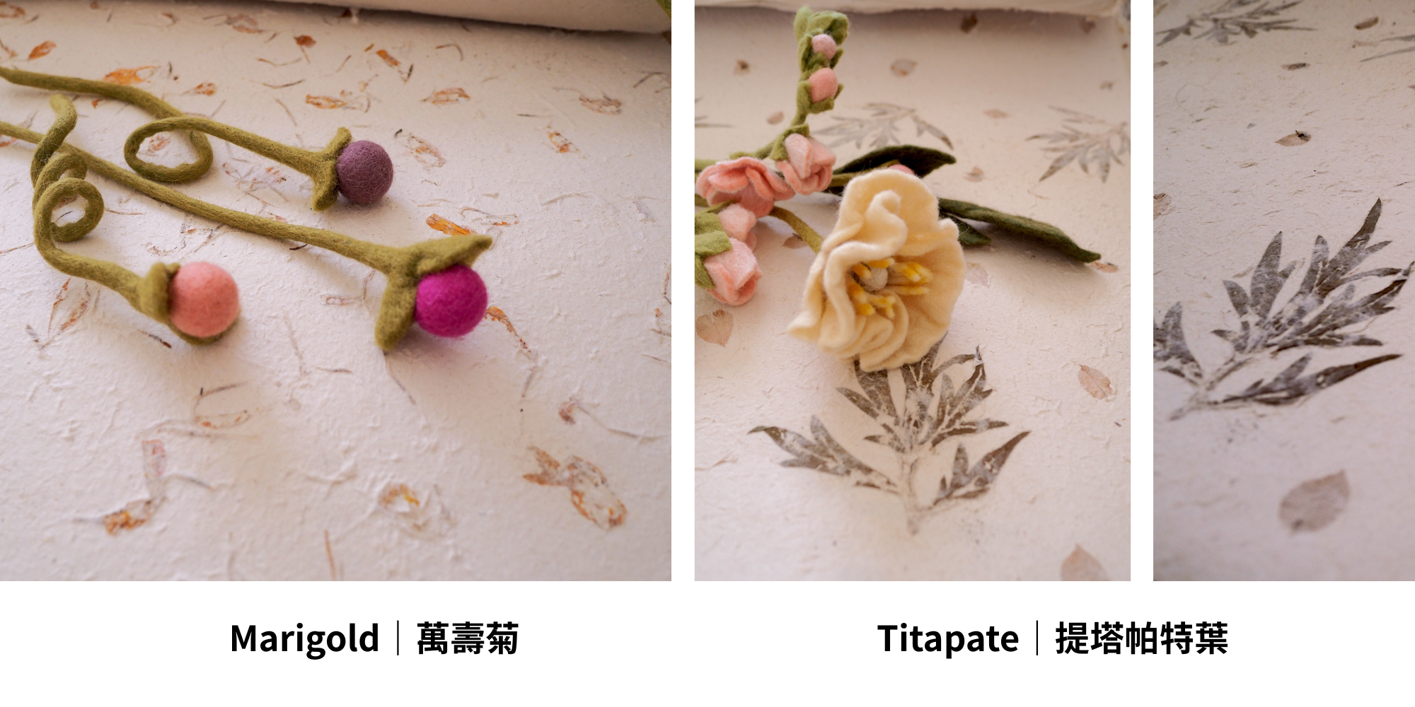 葉片、花瓣或纖維被放進紙漿後,會改變紙的表面結構。讓紙不只是平的,而是有顆粒、有層次。有些植物纖維,也會增加支撐性或透氣性。