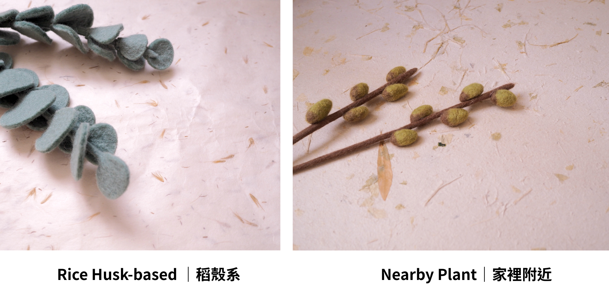 也因此,稻殼與穀物纖維成為一種隨處可見、被再利用的材料,被放進紙裡,成為製作的一部分。